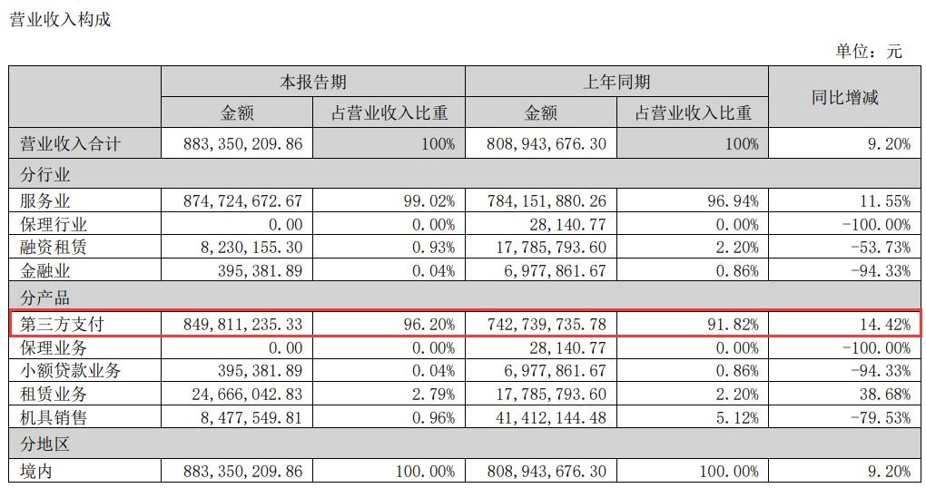 值得注意的是,仁東控股的第三方支付業(yè)務(wù)營(yíng)收8.49億,占整個(gè)集團(tuán)的96.2%。