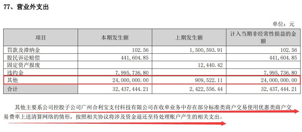 仁東控股中期報(bào)顯示,營(yíng)業(yè)外支出其他主要系公司控股子公司廣州合利寶支付科技有限公司在收單業(yè)務(wù)中存在部分標(biāo)準(zhǔn)類商戶交易使用優(yōu)惠類商戶交易費(fèi)率上送清算網(wǎng)絡(luò)的情形,按照相關(guān)協(xié)議將涉及資金退還至待處理賬戶產(chǎn)生的相關(guān)支出。