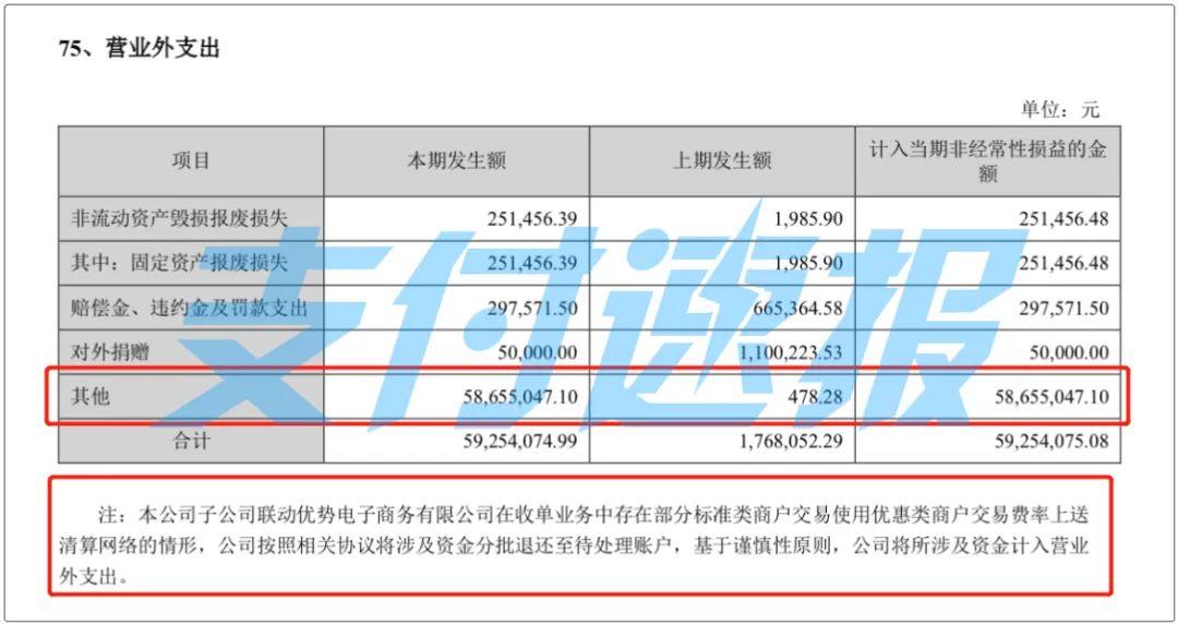 子公司聯(lián)動優(yōu)勢在收單業(yè)務(wù)中存在部分標(biāo)準(zhǔn)類商戶交易使用商戶交易費率上送清算網(wǎng)絡(luò)的情形,公司按照相關(guān)協(xié)議將涉及資金分批退還至待處理賬戶,基于謹(jǐn)慎性原則,公司將所涉及資金計入營業(yè)外支出。公告中,營業(yè)外支出的其他金額為58,655,047.10元