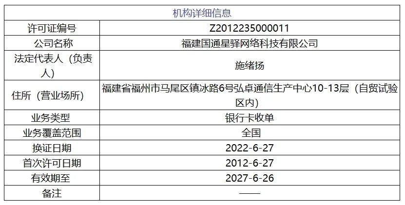 國(guó)通星驛法定代表人從“施緒揚(yáng)”變更為“陳藝”, “施緒揚(yáng)”退出職務(wù):總經(jīng)理、董事; “陳藝”任董事長(zhǎng); “林堅(jiān)”任總經(jīng)理; “江春芬”任財(cái)務(wù)負(fù)責(zé)人。 “胡剛”從董事長(zhǎng)調(diào)整為董事; 王晶從副董事長(zhǎng)調(diào)整為董事! 國(guó)通星驛成立于2010年6月,2016年成為新大陸全資控股的一家專門提供銀行卡收單綜合支付服務(wù)的支付機(jī)構(gòu),其《支付業(yè)務(wù)許可證》資質(zhì)為全國(guó)范圍內(nèi)的銀行卡收單。