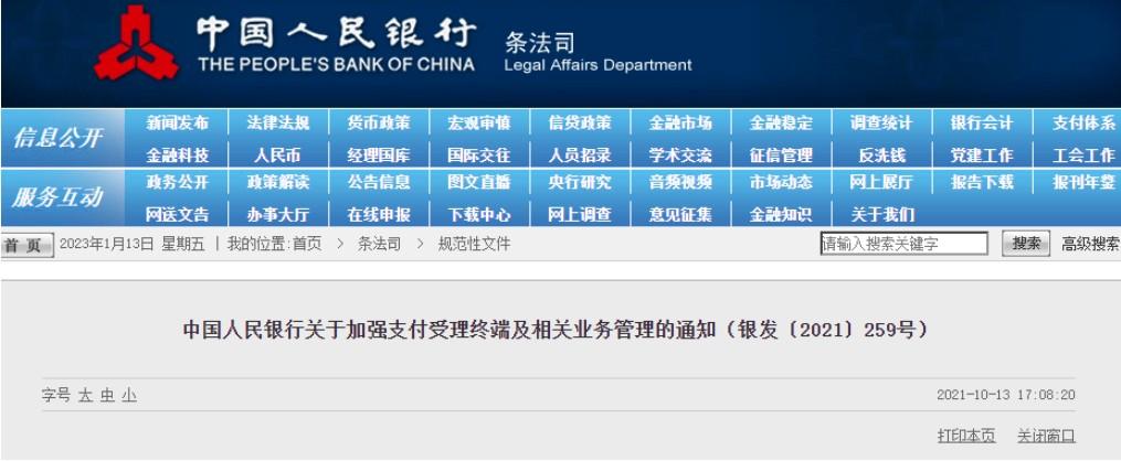 2021年10月13日中國人民銀行發(fā)布《關(guān)于加強(qiáng)支付受理終端及相關(guān)業(yè)務(wù)管理的通知(銀發(fā)〔2021〕259號(hào))》。《通知》自2022年3月1日起施行。