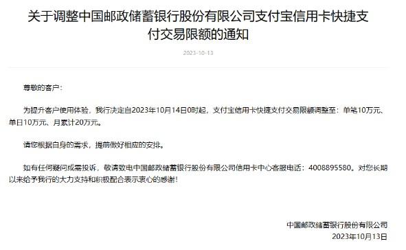 而郵政于第二天直接發(fā)布了調(diào)整支付寶信用卡快捷支付交易限額的通知:
