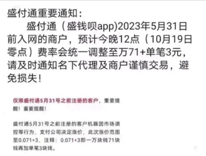 盛付通(盛錢唄app)2023年5月31日前入網(wǎng)的商戶,預(yù)計(jì)今晚12點(diǎn)(10月19日零點(diǎn))費(fèi)率會(huì)統(tǒng)一調(diào)整至萬71+單筆3元,請及時(shí)通知名下代理及商戶謹(jǐn)慎交易,避免損失!