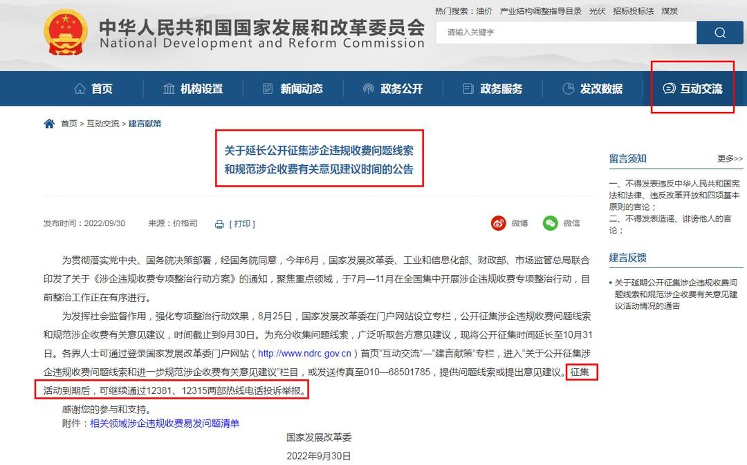 (http://www.ndrc.gov.cn)首頁“互動交流”—“建言獻(xiàn)策”專欄,進(jìn)入“關(guān)于公開征集涉企違規(guī)收費(fèi)問題線索和規(guī)范涉企收費(fèi)有關(guān)意見建議”欄目進(jìn)行填寫真實(shí)發(fā)生事件進(jìn)行投訴!