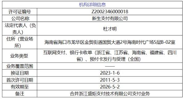 新生支付于2011年5月獲得央行頒發(fā)的支付牌照,2021年牌照續(xù)展成功,有效期至2026年5月2日。值得一提的是,在2016年5月進行第一次牌照續(xù)展時,新生支付合并海航集團旗下另一家支付機構(gòu)——浙江盛炬支付技術(shù)有限公司支付業(yè)務,新增銀行卡收單業(yè)務類型。當前,新生支付業(yè)務類型包括互聯(lián)網(wǎng)支付、銀行卡收單(浙江省、江蘇省、海南省、福建省、四川?。┮约叭珖秶鷥?nèi)的預付卡發(fā)行與受理。