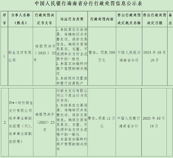10月19日,中國人民銀行海南省分行顯示,新生支付有限公司由于業(yè)務違規(guī)行為被處罰。