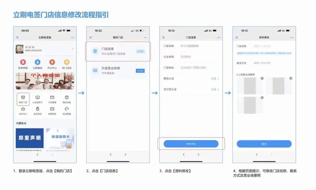根據(jù)目前已固定一機(jī)一戶的支付公司產(chǎn)品,如何更換商戶,小編做了一個(gè)匯總,有需要的可以看下:嘉聯(lián)立刷POS機(jī)如何修改商戶名稱:登錄立刷電簽版--我的門店--門店信息--資料修改--根據(jù)頁(yè)面提示,可修改門店名稱、聯(lián)系方式、店鋪場(chǎng)景照。