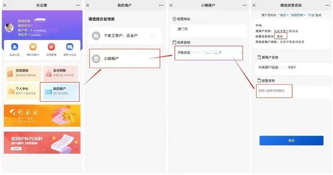杉德POS機(jī)修改商戶名稱教程:杉德杉云寶公眾號,左下角注冊登錄(賬號密碼登錄,賬號手機(jī)號,密碼身份證后六位,選擇微信快捷登錄);登錄后首頁--點(diǎn)擊我的商戶--選擇商戶類型--點(diǎn)擊經(jīng)營名稱下面的商戶名稱--按舉例修改經(jīng)營名稱