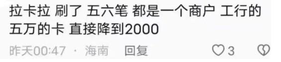 昨天剛有一個持卡人,用拉卡拉POS機器刷卡,五六筆都是顯示同一個商戶消費,工行額度五萬的信用卡,直接降額至2000!