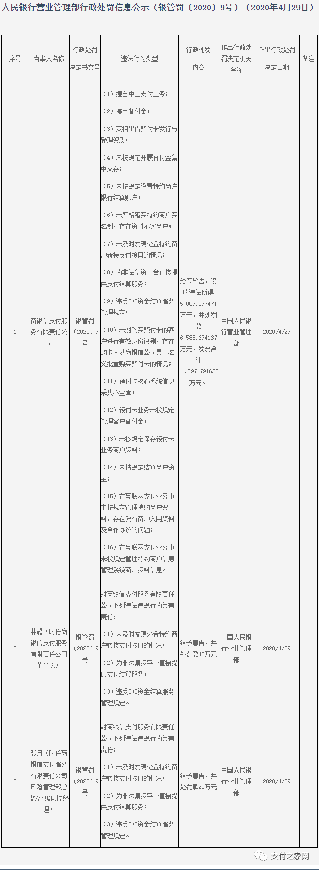 處罰事項(xiàng):(1)擅自中止支付業(yè)務(wù);(2)挪用備付金;(3)變相出借預(yù)付卡發(fā)行與受理資質(zhì);(4)未按規(guī)定開展備付金集中交存;(5)未按規(guī)定設(shè)置特約商戶銀行結(jié)算賬戶;(6)未嚴(yán)格落實(shí)特約商戶實(shí)名制,存在資料不實(shí)商戶;(7)未及時(shí)發(fā)現(xiàn)處置特約商戶轉(zhuǎn)接支付接口的情況;(8)為非法集資平臺(tái)直接提供支付結(jié)算服務(wù);(9)違反T+0資金結(jié)算服務(wù)管理規(guī)定;(10)未對(duì)購(gòu)買預(yù)付卡的客戶進(jìn)行有效身份識(shí)別,存在購(gòu)卡人以商銀信公司員工名義批量購(gòu)買預(yù)付卡的情況;(11)預(yù)付卡核心系統(tǒng)信息采集不全面;(12)預(yù)付卡業(yè)務(wù)未按規(guī)定管理客戶備付金;(13)未按規(guī)定保存預(yù)付卡業(yè)務(wù)商戶資料;(14)未按規(guī)定結(jié)算商戶資金;(15)在互聯(lián)網(wǎng)支付業(yè)務(wù)中未按規(guī)定管理特約商戶資料,存在沒有商戶入網(wǎng)資料及合作協(xié)議的問題;(16)在互聯(lián)網(wǎng)支付業(yè)務(wù)中未按規(guī)定管理特約商戶信息管理系統(tǒng)商戶資料信息。
