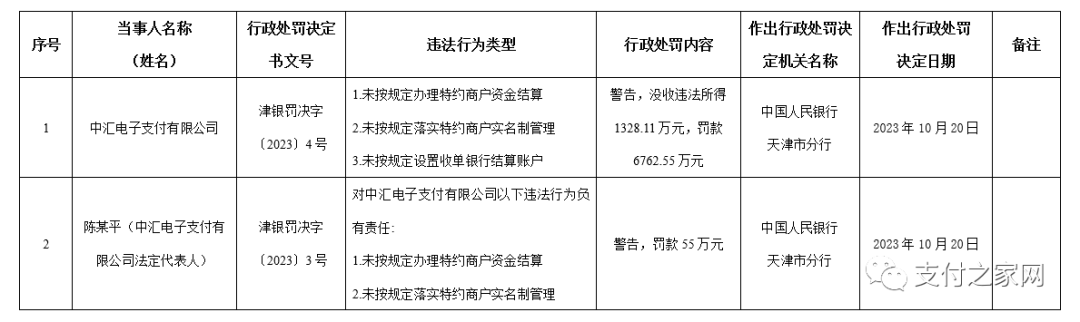 近日,人民銀行天津分行開出“天價(jià)罰單”,中匯電子支付有限公司因存在多項(xiàng)違法違規(guī)行為,被予以警告,并沒收違法所得1328.11萬元,罰款6762.55萬元。