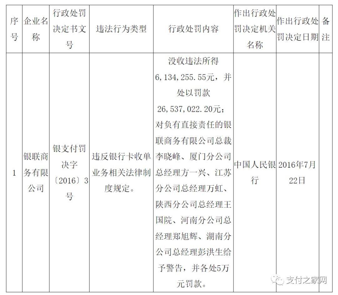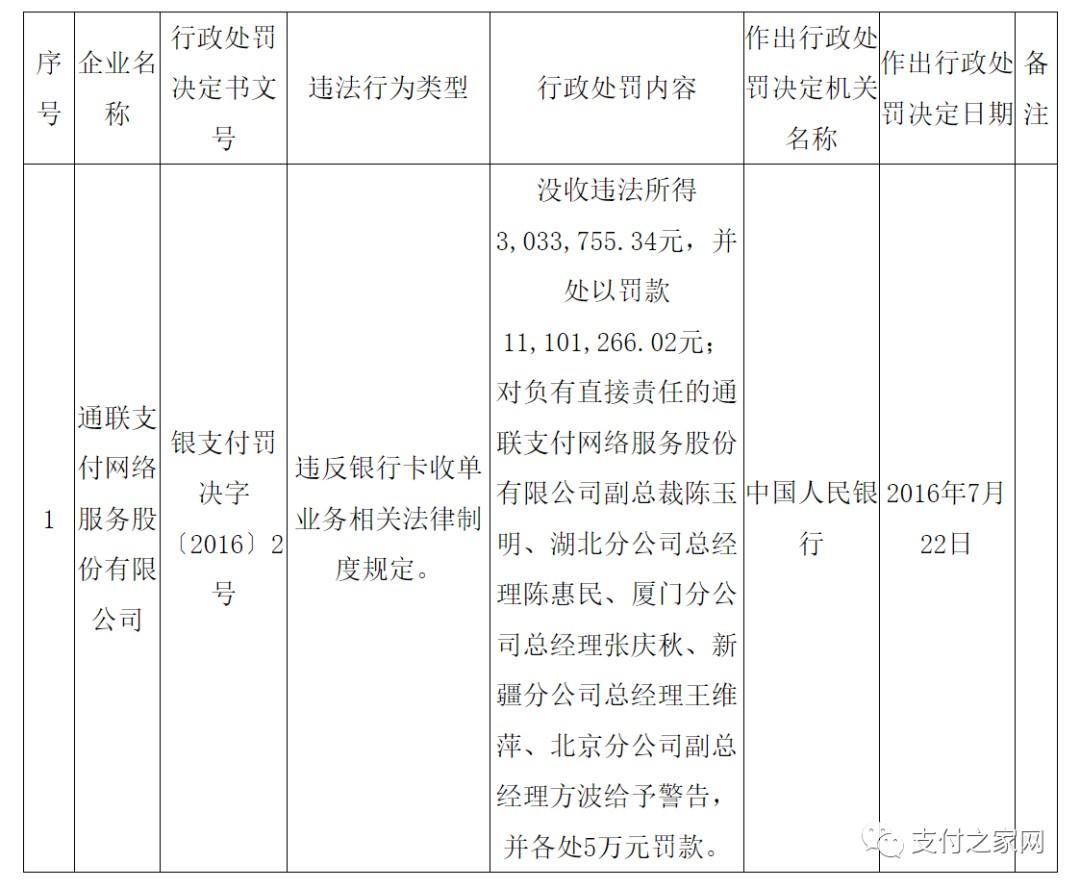 處罰決定書文號(hào):銀支付罰決字〔2016〕3號(hào)