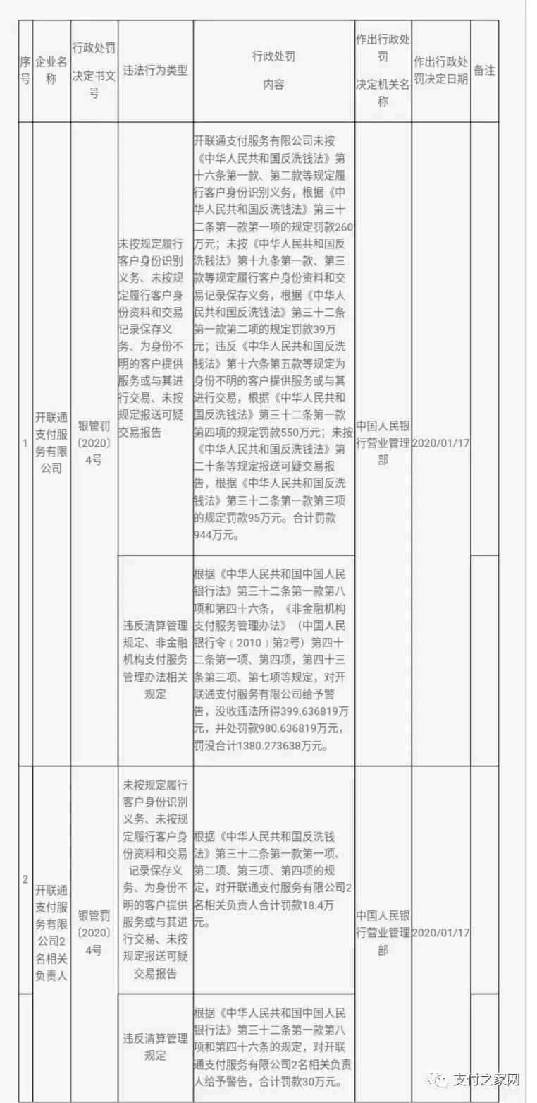 處罰金額:開聯(lián)通支付服務(wù)有限公司未按《中華人民共和國(guó)反洗錢法》第十六條第一款、第二款等規(guī)定履行客戶身份識(shí)別義務(wù),根據(jù)《中華人民共和國(guó)反洗錢法》第三十二條第一款第一項(xiàng)的規(guī)定罰款260萬元;未按《中華人民共和國(guó)反洗錢法》第十九條第一款、第三款等規(guī)定履行客戶身份資料和交易記錄保存義務(wù),根據(jù)《中華人民共和國(guó)反洗錢法》第三十二條第一款第二項(xiàng)的規(guī)定罰款39萬元;違反《中華人民共和國(guó)反洗錢法》第十六條第五款等規(guī)定為身份不明的客戶提供服務(wù)或與其進(jìn)行交易,根據(jù)《中華人民共和國(guó)反洗錢法》第三十二條第一款第四項(xiàng)的規(guī)定罰款550萬元;未按《中華人民共和國(guó)反洗錢法》第二十條等規(guī)定報(bào)送可疑交易報(bào)告,根據(jù)《中華人民共和國(guó)反洗錢法》第三十二條第一款第三項(xiàng)的規(guī)定罰款95萬元。合計(jì)罰款944萬元。根據(jù)《中華人民共和國(guó)中國(guó)人民銀行法》第三十二條第一款第八項(xiàng)和第四十六條,《非金融機(jī)構(gòu)支付服務(wù)管理辦法》(中國(guó)人民銀行令﹝2010﹞第2號(hào))第四十二條第一項(xiàng)、第四項(xiàng),第四十三條第三項(xiàng)、第七項(xiàng)等規(guī)定,對(duì)開聯(lián)通支付服務(wù)有限公司給予警告,沒收違法所得399.636819萬元,并處罰款980.636819萬元,罰沒合計(jì)1380.273638萬元。