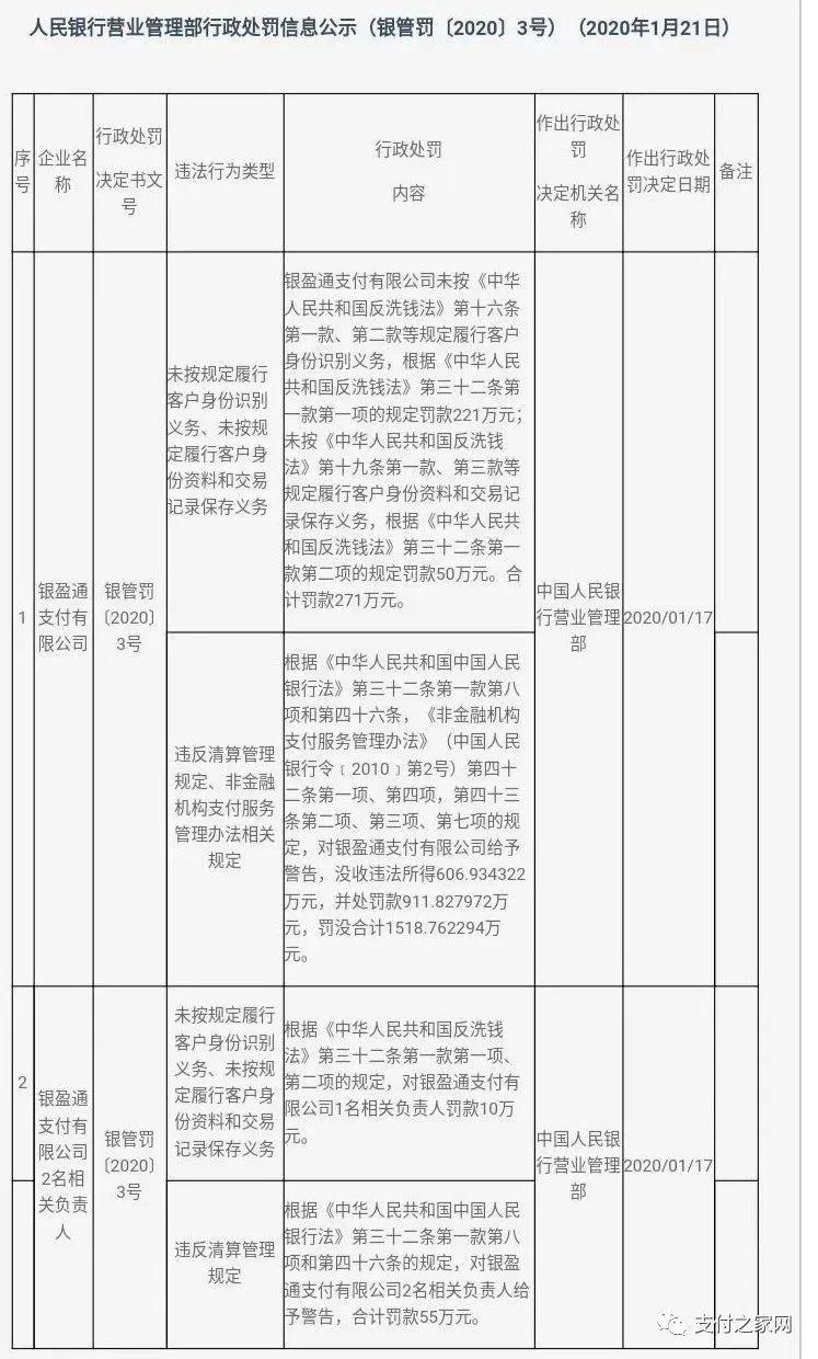 處罰金額:銀盈通支付有限公司未按《中華人民共和國(guó)反洗錢法》第十六條第一款、第二款等規(guī)定履行客戶身份識(shí)別義務(wù),根據(jù)《中華人民共和國(guó)反洗錢法》第三十二條第一款第一項(xiàng)的規(guī)定罰款221萬元;未按《中華人民共和國(guó)反洗錢法》第十九條第一款、第三款等規(guī)定履行客戶身份資料和交易記錄保存義務(wù),根據(jù)《中華人民共和國(guó)反洗錢法》第三十二條第一款第二項(xiàng)的規(guī)定罰款50萬元。合計(jì)罰款271萬元。根據(jù)《中華人民共和國(guó)中國(guó)人民銀行法》第三十二條第一款第八項(xiàng)和第四十六條,《非金融機(jī)構(gòu)支付服務(wù)管理辦法》(中國(guó)人民銀行令﹝2010﹞第2號(hào))第四十二條第一項(xiàng)、第四項(xiàng),第四十三條第二項(xiàng)、第三項(xiàng)、第七項(xiàng)的規(guī)定,對(duì)銀盈通支付有限公司給予警告,沒收違法所得606.934322萬元,并處罰款911.827972萬元,罰沒合計(jì)1518.762294萬元。