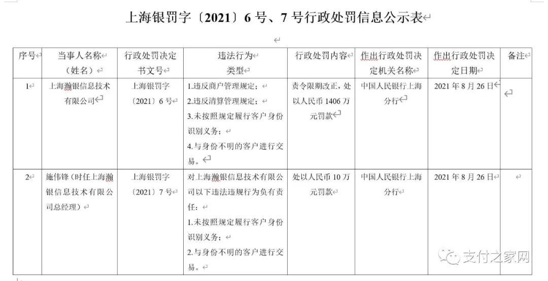 處罰決定書文號(hào):上海銀罰字〔2021〕6號(hào)