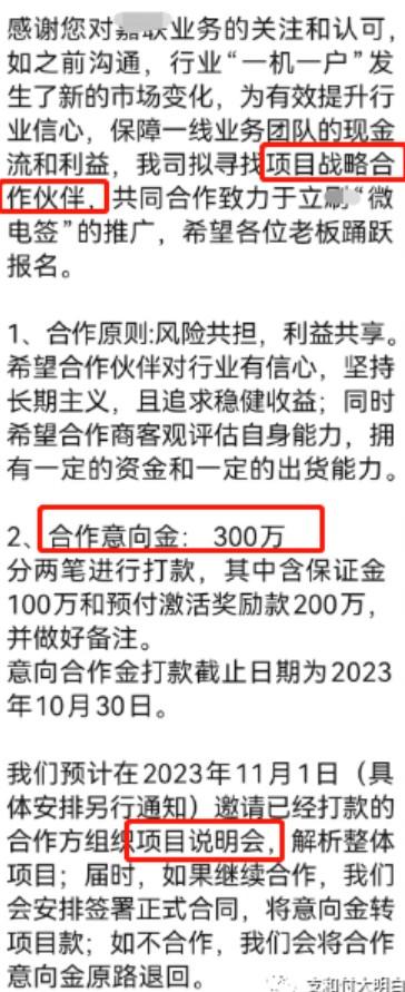 POS機(jī)代理項(xiàng)目戰(zhàn)略合作伙伴,合作意向金300萬,其中保證金100萬和預(yù)付激活獎(jiǎng)勵(lì)款200萬。據(jù)透露,這300萬只是合作意向金,貨款需要另外支付,合作門檻10萬臺(tái)起步。