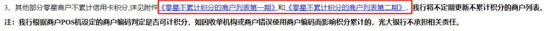 除此之外,在積分獎勵細則中,我們還發(fā)現(xiàn),這次光大銀行也學(xué)習(xí)招商銀行搞了幾萬個不計積分的黑名單商戶,也就是我們熟知的“天書”。足以見得,現(xiàn)在銀行對積分這塊管得越來越嚴格了,一些擼羊毛的客戶的空間也越來越少了。