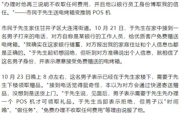"說是免費(fèi)贈(zèng)送電烤箱,人來了卻是推銷POS機(jī)……"近日,市民于先生表示自己疑似被辦理POS機(jī)的推銷員"套路"了。10月21日,他接到一名男子打來的電話,對(duì)方自稱是某銀行的工作人員,為回饋優(yōu)質(zhì)客戶,給于先生送免費(fèi)禮品電烤箱。于先生沒想到的是,見面后非但沒有送來電烤箱,還要幫助對(duì)方"做任務(wù)"辦理POS機(jī),最終被劃走405元"激活費(fèi)"。他想提醒市民們警惕類似套路,防止上當(dāng)受騙。