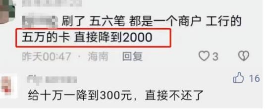 有持卡人表示,自己十萬額度的卡被降到5000元,降額幅度額度之大。此外還有持卡人在同一個商戶多筆刷卡,五萬額度直接降到2000元。