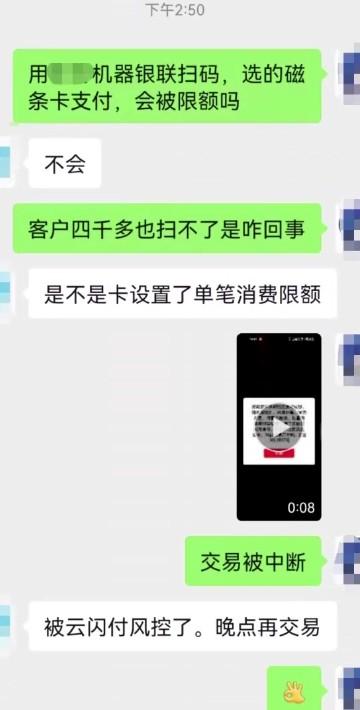 但是,有些客戶上來就來個猛的,直逼兩萬的額度去掃,結(jié)果交易直接被銀聯(lián)中斷,明顯被銀聯(lián)風控了。