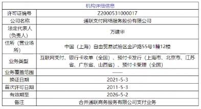 據(jù)小編了解,通聯(lián)支付成立于2008年10月,創(chuàng)始人系萬建華,2011年5月3日獲得支付牌照,2016年5月3日首次續(xù)展時合并了關(guān)聯(lián)機(jī)構(gòu)通聯(lián)商務(wù)服務(wù)有限公司的支付業(yè)務(wù)。在2021年5月第二次續(xù)展后,通聯(lián)支付目前支付業(yè)務(wù)類型為互聯(lián)網(wǎng)支付、銀行卡收單(全國)、預(yù)付卡發(fā)行(上海市、北京市、江蘇省、廣東省、山西?。?、預(yù)付卡受理(全國)等。