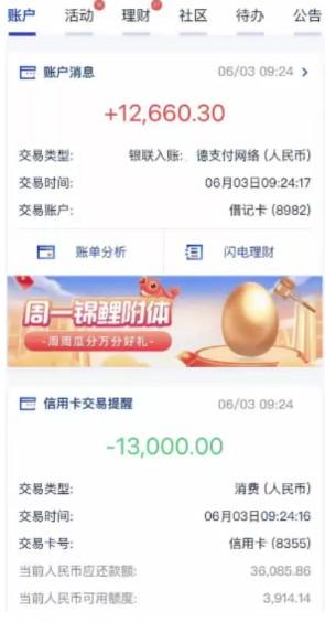 提醒大家,刷卡之前稍費(fèi)點(diǎn)事核實(shí)下終端費(fèi)率。商戶刷卡13000,到賬12660.3,手續(xù)費(fèi)共扣除339.7元。