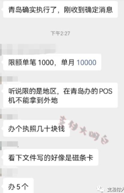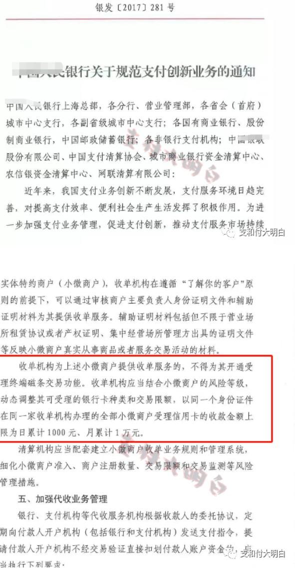 有代理商群發(fā):以同一個身份證件在同一家收單機構辦理的全部小微商戶受理信用卡的金額上限日累計1000元,月累計1萬元,預計11月27開始執(zhí)行。