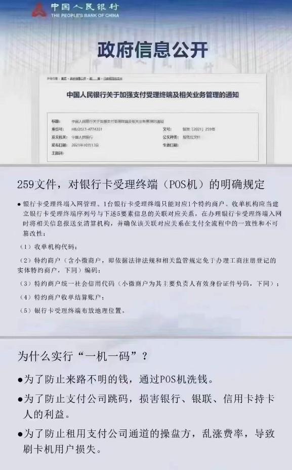 國務(wù)院259文號?件一機(jī)碼一??(卡刷?不再變商戶),是中人國?民銀對行?整個(gè)支付行業(yè)的一個(gè)文件,全業(yè)行?的整改!