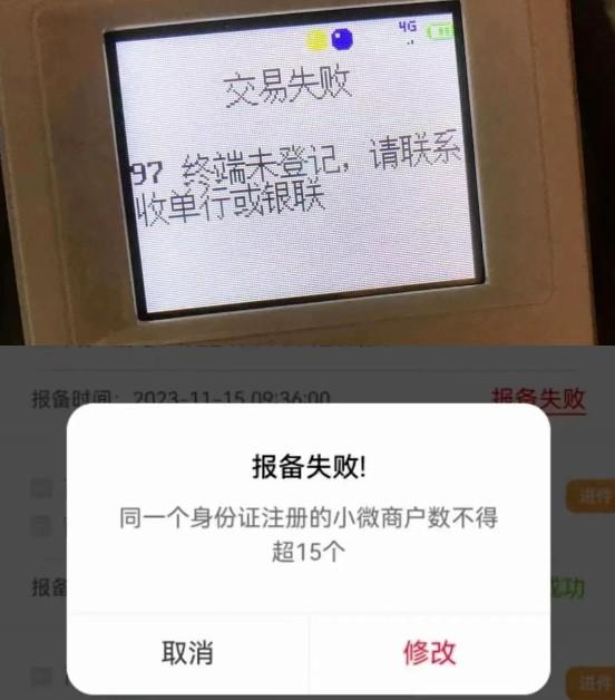 259過(guò)后,全部機(jī)器一機(jī)一碼。不少用戶在辦理機(jī)器過(guò)后,使用過(guò)程中會(huì)遇到報(bào)備失敗、交易失敗、無(wú)效商戶、終端未登記等提示。這些情況可能是因?yàn)楸汇y聯(lián)限制入網(wǎng)了,因?yàn)殂y聯(lián)規(guī)定:“同一個(gè)身份證注冊(cè)銀聯(lián)小微商戶數(shù)不得超過(guò)15個(gè)”。