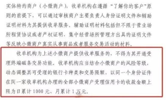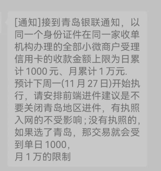 接到青島銀聯(lián)通知,以同一個(gè)身份證件在同一家收單機(jī)構(gòu)辦理的全部小微商戶受理信用卡的收款金額上限為日累計(jì)1000元、月累計(jì)1萬元。