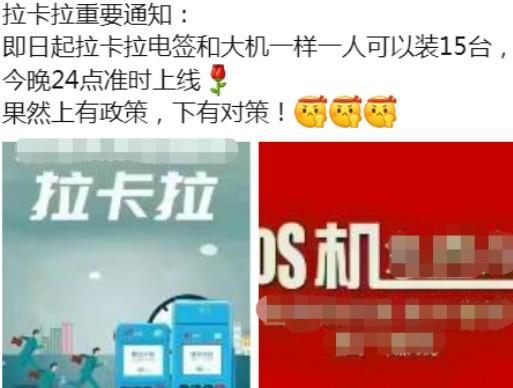 近日,拉卡拉全面落實259號文,開始全面執(zhí)行一機一戶。然而上有政策,下有對策。拉卡拉開放了電簽和大機的限制,1個用戶可以裝15臺。