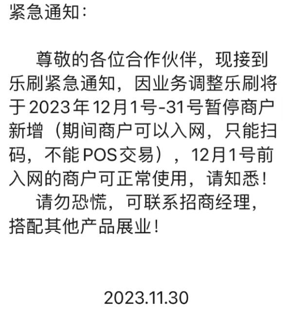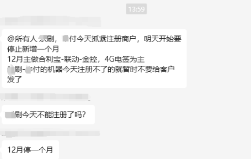 就在11月30日,某操盤大佬群內(nèi)發(fā)通知,樂刷,中付今天抓緊注冊商戶,明天開始要停止新增一個月,樂刷,中付的機器今天注冊不了的就暫時不要給客戶發(fā)了。