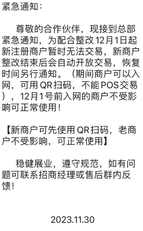 加上之前代理商曝出的后臺收到??迫可虘魰和P略龅耐ㄖ?,已經(jīng)有3家確定暫停全部商戶新增30天。