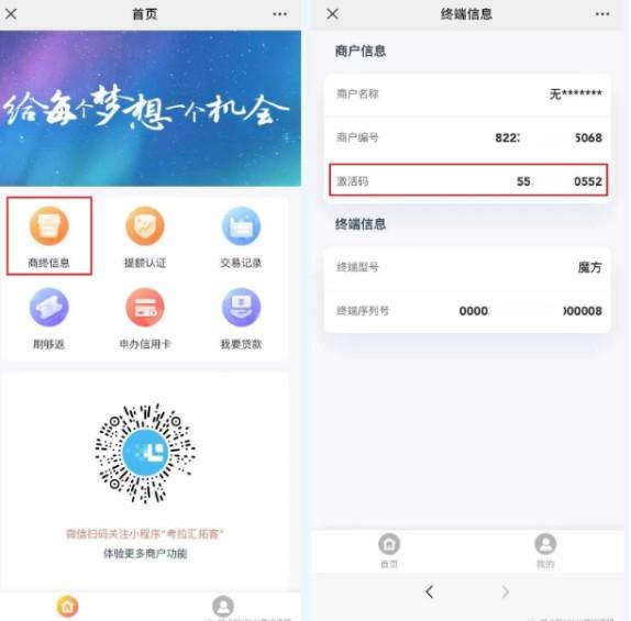 第四步:微信再次掃描機(jī)器背面二維碼,輸入身份證后六位進(jìn)入商戶版匯拓客H5頁面,查詢激活碼