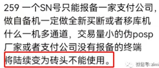 259落地,不符合政策規(guī)定的機(jī)器都將被停止使用,其中:藍(lán)牙機(jī)MPOS,更改SN,或者更換支付公司的機(jī)器,以及POSP下的自備機(jī)!