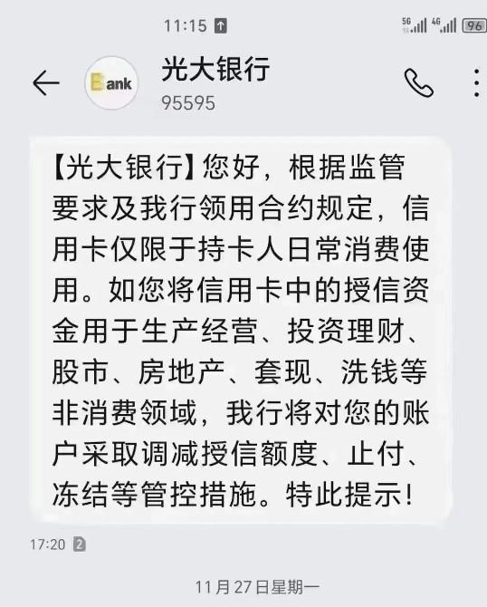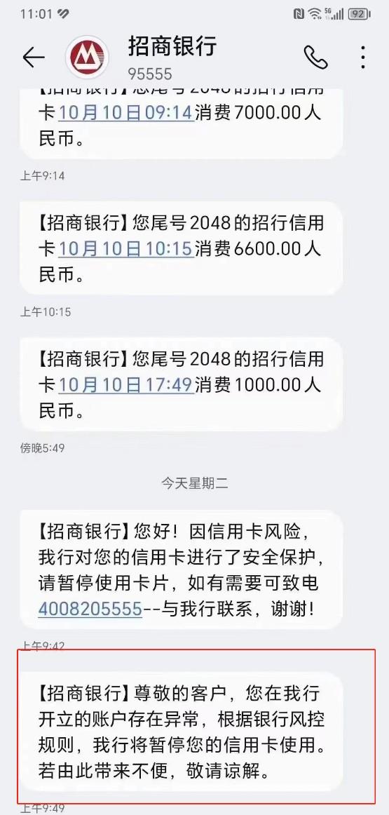 招商銀行:根據(jù)銀行風(fēng)控規(guī)則,將暫停信用卡使用。