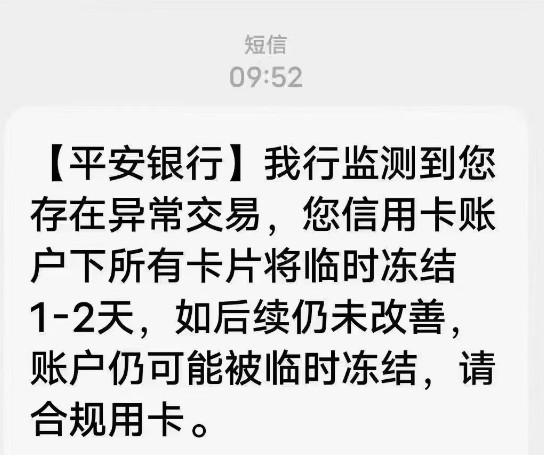 平安銀行:將臨時凍結(jié)賬戶下所有卡片1-2天,如后續(xù)仍未改善,賬戶仍可能被臨時凍結(jié)。