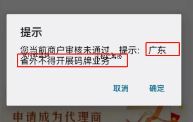 某手機(jī)POS為了合規(guī)在新增商戶時(shí)提示:“您當(dāng)前商戶審核未通過,提示:廣東省外不得開展碼牌業(yè)務(wù)”。