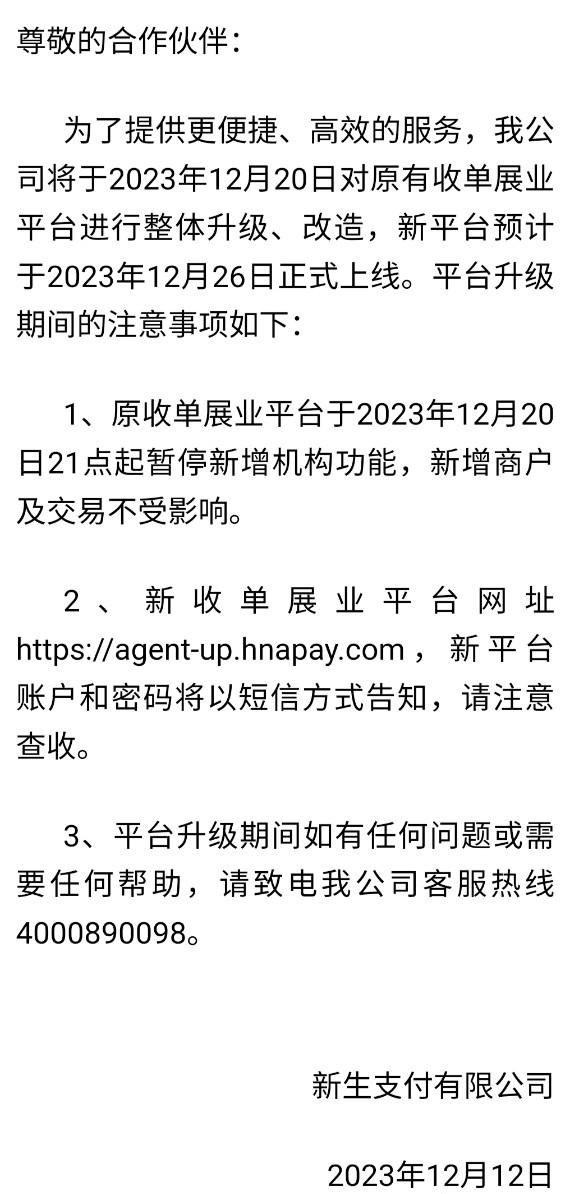 新生支付收單展業(yè)平臺升級改造,暫停新增機構(gòu)功能 lakala 2年前 ( 2023-12-21 ) 394 新生支付通知:暫停新增機構(gòu)新生支付發(fā)布通知:12月20日對原有收單展業(yè)平臺進行整體升級、改造,新平臺26日上線,在此期間,暫停新增機構(gòu)功能,新增商戶及交易不受影響。 The End 標簽:博主很懶,并沒有設(shè)置標簽