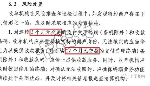 另外,根據(jù)相關(guān)文件規(guī)定,對連續(xù)3個月無交易且無法核實(shí)身份的和連續(xù)12月無交易的商戶,POS機(jī)也會被強(qiáng)制關(guān)閉。目前,已有支付公司通知超出小微商戶入網(wǎng)限制且連續(xù)3個月無交易的商戶將在12.31日之前陸續(xù)被強(qiáng)制關(guān)閉刷卡功能,卡校長認(rèn)為,其它支付公司后續(xù)也會跟進(jìn)。上述規(guī)則的實(shí)行,相信對許多卡友們來說,影響是蠻大的,卡友們需及時做好打算。