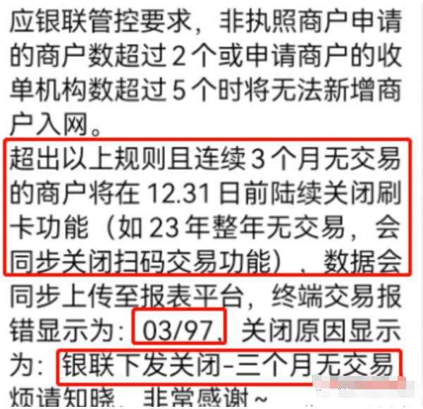 由于銀聯(lián)的管理規(guī)定,當一個非執(zhí)照商戶申請超過2個商戶或超過5個收單機構的商戶時,將無法新增商戶入網(wǎng)。此外,對于連續(xù)3個月無交易的商戶,將在今年12月31日前陸續(xù)關閉刷卡功能。如果商戶在2023年全年內(nèi)都沒有任何交易,其掃碼交易功能也將被關閉。這些關閉的商戶數(shù)據(jù)將會同步上傳至報表平臺,終端交易報錯代碼為03/97,關閉原因為“銀聯(lián)下發(fā)關閉-三個月無交易”。