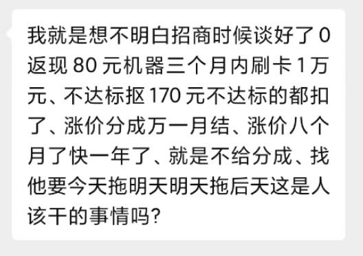 當(dāng)初從某機(jī)構(gòu)手里拿的0.51結(jié)算+刷3000反80的POS機(jī)現(xiàn)在分潤無法提現(xiàn)了,說好的漲價分成,現(xiàn)在分成也拿不到了。