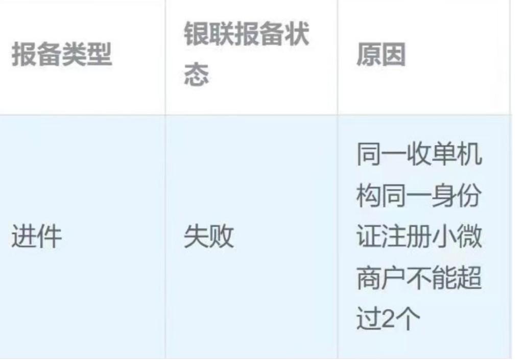 銀聯(lián)報(bào)備返回:同一收單機(jī)構(gòu)同一身份證注冊(cè)小微商戶不能超過2個(gè),解決方案如下: