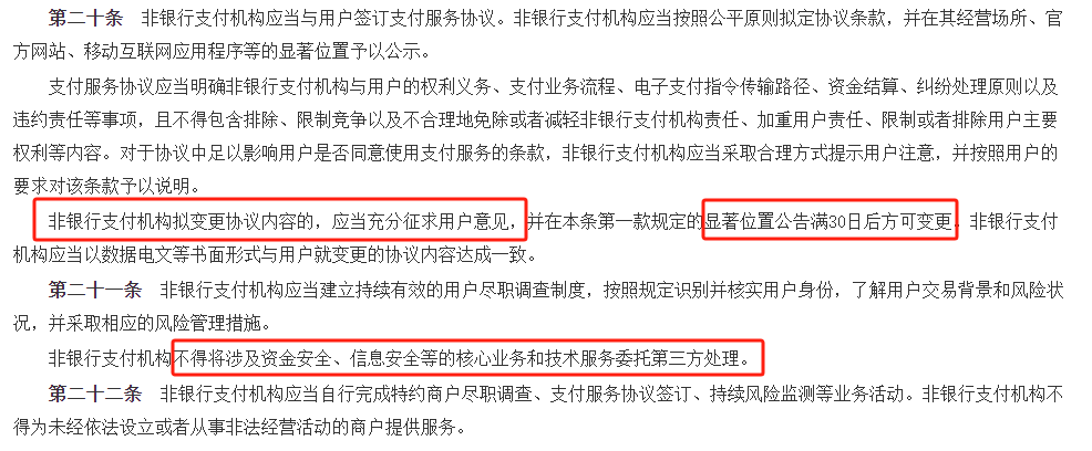 其中要求:非銀機構(gòu)擬變更協(xié)議內(nèi)容的,應當充分征求用戶意見,并在顯著位置公告滿30日后方可變更。核心業(yè)務,不得委托第三方處理。
