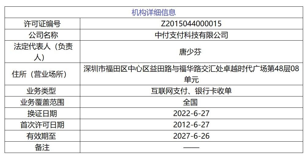 中付支付成立于2007年3月,2012年獲得央行頒發(fā)的《支付業(yè)務(wù)許可證》,擁有全國性的互聯(lián)網(wǎng)支付和銀行卡收單業(yè)務(wù),也是國內(nèi)為數(shù)不多的線上線下“全牌照”。