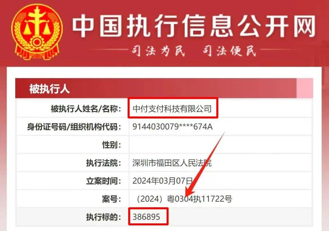 中國執(zhí)行信息公開網(wǎng)顯示,中付支付成被執(zhí)行人,執(zhí)行法院為深圳市福田區(qū)人民法院,立案時(shí)間2024年3月7日,執(zhí)行標(biāo)的386895。