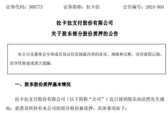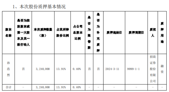2024年3月13日晚間,拉卡拉公告,公司股東孫浩然先生質(zhì)押其所持有的部分股份,本次質(zhì)押數(shù)量為324萬股,占其所持股份比例為13.91%,占公司總股本比例為0.40%。