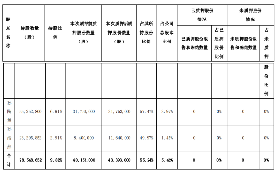截至公告披露日,孫浩然先生所持質(zhì)押股份占其所持股份比例為49.97%,占公司總股本比例為1.45%。