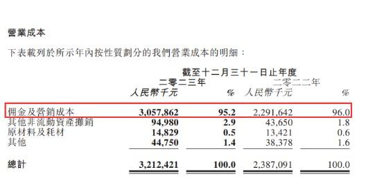 報告顯示,移卡2023年度的營業(yè)成本同比增長34.6%,為人民幣32.124億元,主要由于一站式支付服務GPV總量上升,導致我們向支付分銷渠道支付的傭金增加所致。其中傭金和營銷成本為人民幣30.57億元,占比整個公司營業(yè)成本的95.2%。