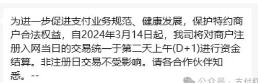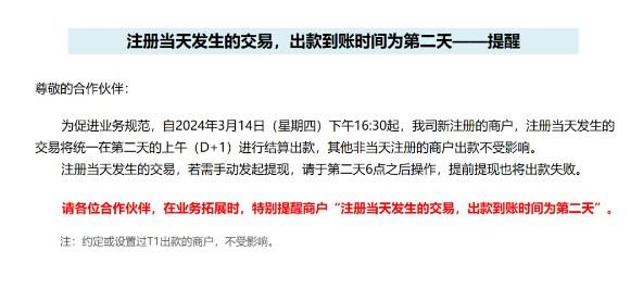 為進(jìn)一步促進(jìn)支付業(yè)務(wù)規(guī)范、健康發(fā)展,保護(hù)特約商戶合法權(quán)益,自2024年3月14日起,我司將對商戶注冊入網(wǎng)當(dāng)日的交易統(tǒng)一于第二天上午(D+1)進(jìn)行資金結(jié)算。非注冊日交易不受影響。請各合作伙伴知悉。